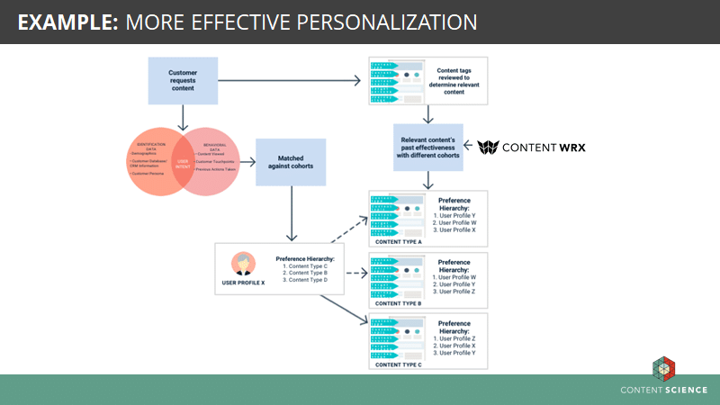 Personalization: You can also use analytics to figure out whether you need to personalize or tailor content for specific audiences or customers. This chart shows an example of when a customer requests content and the most effective combination of content is delivered using cohort analysis.