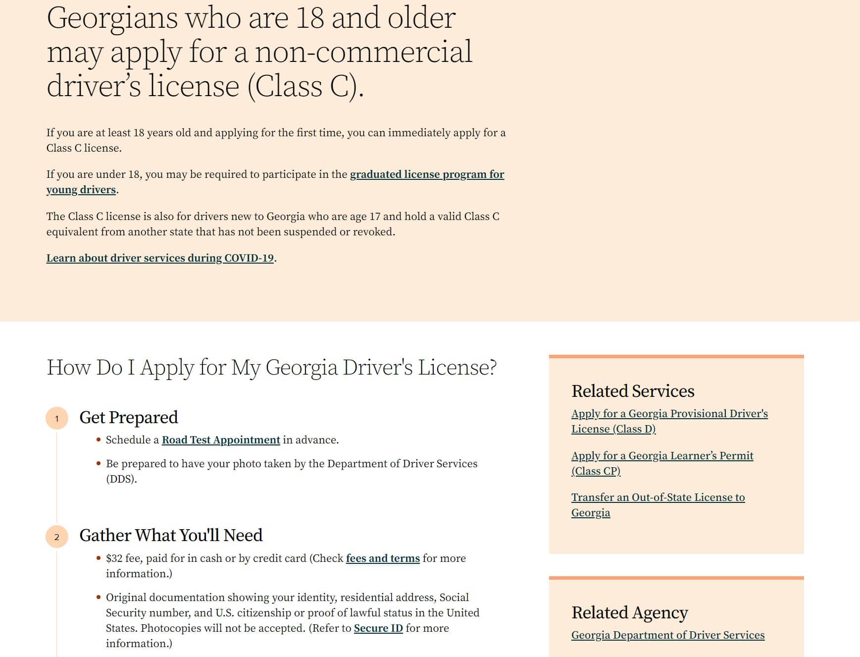 Government websites provide additional examples of how to use instruction to guide users. For example, Georgia’s state website uses a specific page template type to help give users instructions for complex tasks such as obtaining a driver’s license. The template includes clear, numbered directions for how to apply for a driver’s license.
