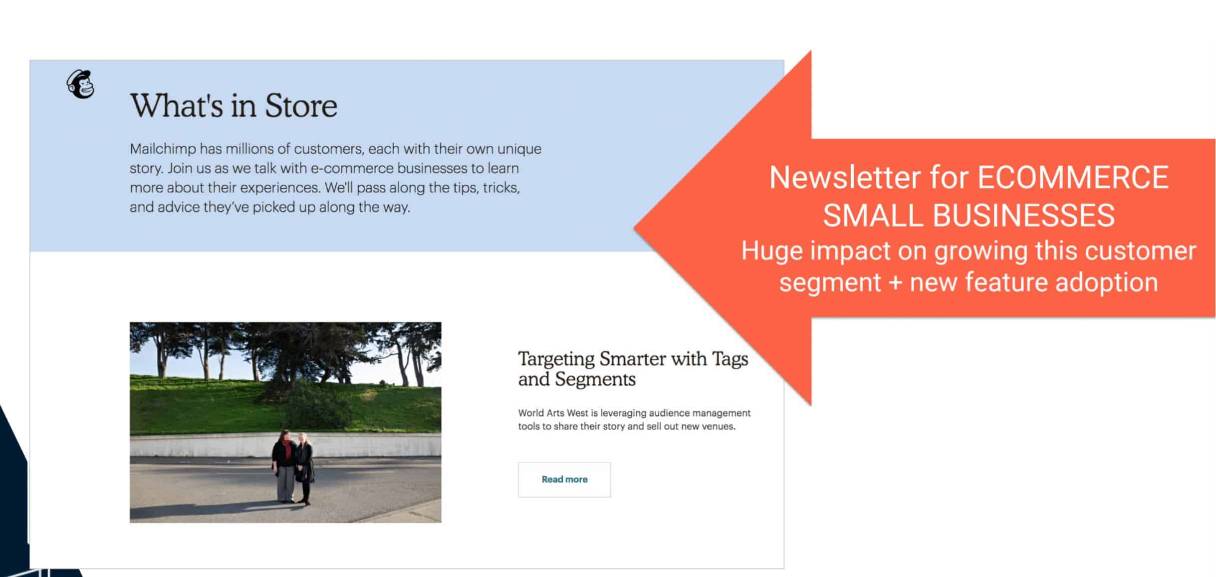 Mailchimp also does a good job of matching content to customer type. For example, they create a newsletter that is specifically for e-commerce small businesses.