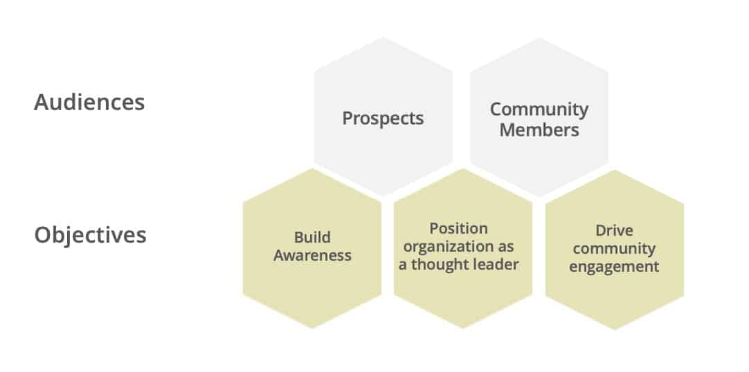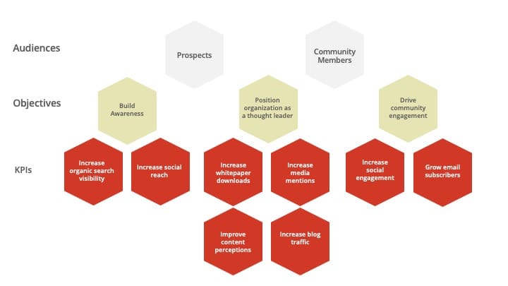 At the top of your measurement plan, list the various audiences you’re trying to influence with your content. If you’ve created user journeys, these user groups would be a good place to start as you likely have a good idea of key goals for each audience.