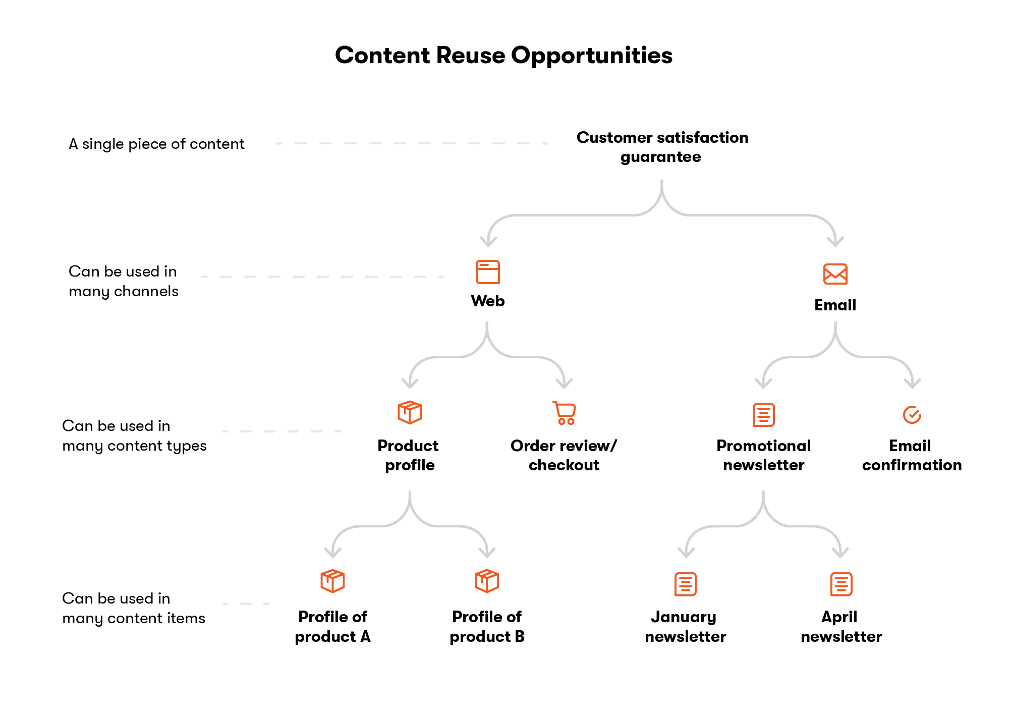 When content is modular and multipurpose, it becomes a shared, reusable resource. Anyone who needs to can reuse or update existing content. The value of content assets to the organization grows each time they get reused.