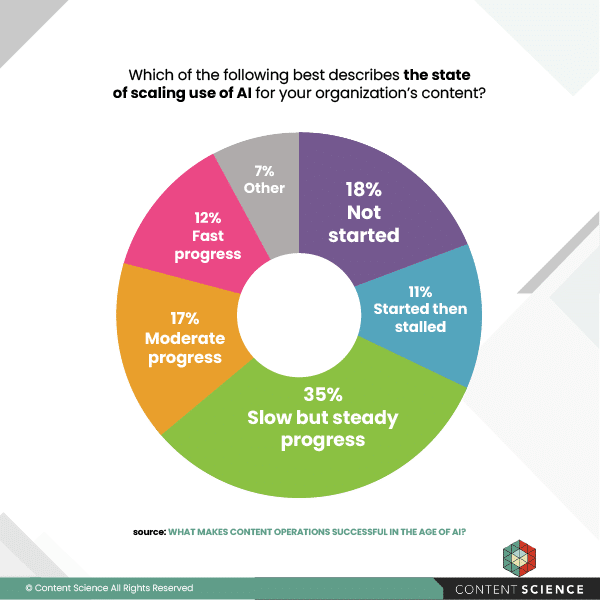However, when it comes to scaling adoption of AI, organizations are struggling–especially for content creation use cases. Slightly less than a third of participants report moderate or fast progress, and slightly more than a third report slow but steady progress. The rest are not making progress either because haven’t started or the effort stalled, as you can see in this chart.