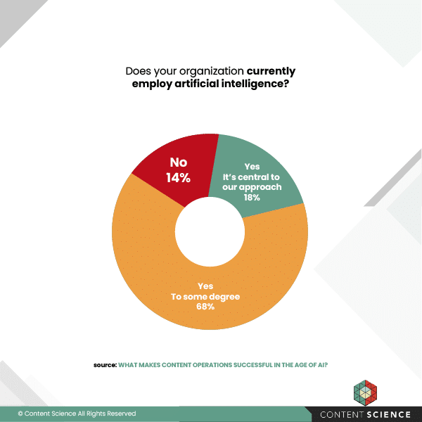 Yes, many more organizations are at least experimenting with AI. Nearly 90% of participants report using AI, and nearly 20% report AI as central to their content approach, as you can see in this chart.